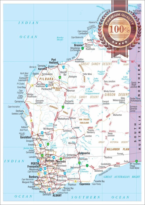 Detailed Map of Western Australia WA Aus Australian Roads Premium